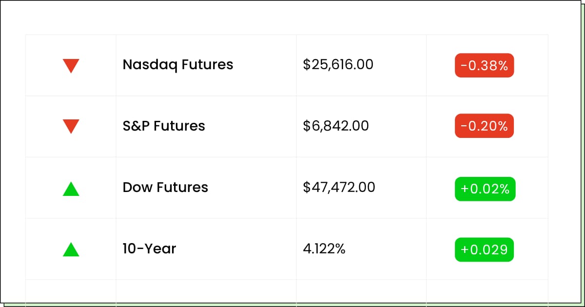 Pretty flat today after yesterday’s sprint. AI is catching its breath as a weak guide from an AI infra name and a chipstake sale cool the hype, while dip-buyers eye yesterday’s bounce in the megacaps. The Senate’s shutdown deal keeps hopes alive that Washington reopens and the data firehose turns back on, so traders are leaning patient rather than panicked.